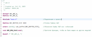 В файле adc.h опишем наши определения, а именно размер буфера данных АЦП и прототип функции инициализации