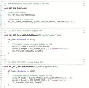 В функции void HAL_ADC_ConvCpltCallback(ADC_HandleTypeDef* hadc) мы по событию от DMA, что вторая половина буфера АЦП заполнена, передаем очередную порцию результата преобразования АЦП в USB.