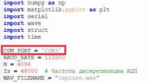 Далее используя скрипт среды Python можем посмотреть, что там оцифровывает наш АЦП. Для этого необходимо установить среду Python и необходимые библиотеки, а именно: