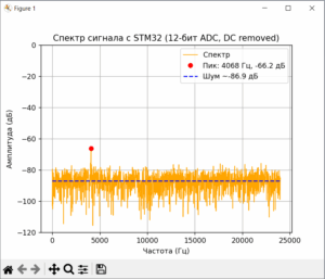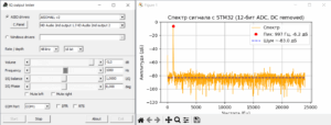 Цель подать сигнал на один из входов АЦП, и для его анализа использовать подключение по USB как VirtualComPort на ПК, а скриптом Python смотреть спектр оцифрованного сигнала и собирать WAV файл для анализа в программах, например как SpectraPLUS. Таким образом мы увидим именно то, что оцифровывает АЦП.