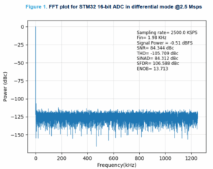 Я планирую использовать АЦП STM32H723ZGT6 для оцифровки сигналов I/Q от SDR стенда, который собрал на предыдущих этапах, в данной стмке очень неплохой 16-битный АЦП, вот картинка измерений 16-битного АЦП от ST