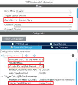 Тут видим, что шины тактирования таймеров настроены на частоту 84 МГц. АЦП стмки будем тактировать от таймера TIM2 с частотой дискретизации Fs = 48 кГц. Для этого настроим таймер соответствующим образом