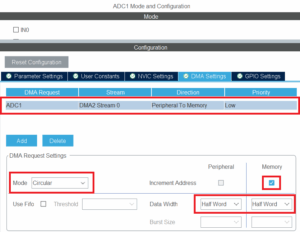 В функции void ADC_DMA_Init(void) мы запускаем таймер TIM2 и непрерывное преобразование АЦП, буфер АЦП заполняется через DMA в цикле не мешая основному циклу программы, но у нас он тут и не используется.