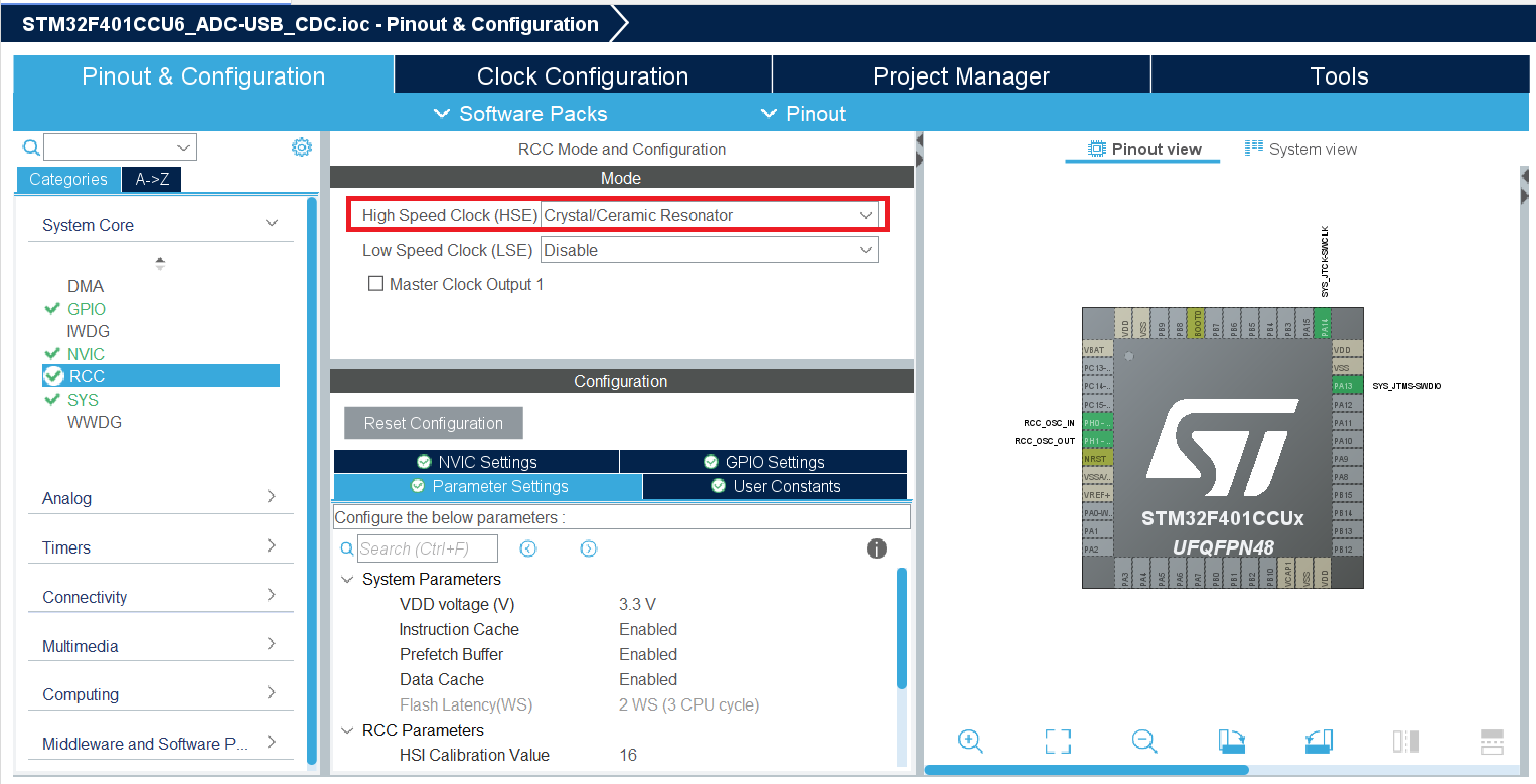 Теперь настроим коммуникацию с ПК, а именно USB порт стмки, чтобы он определялся в системе как VirtualComPort