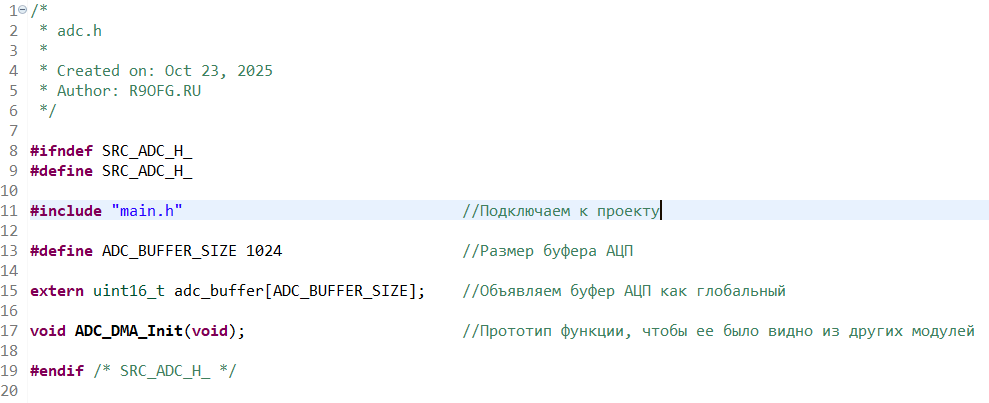В файле adc.h опишем наши определения, а именно размер буфера данных АЦП и прототип функции инициализации
