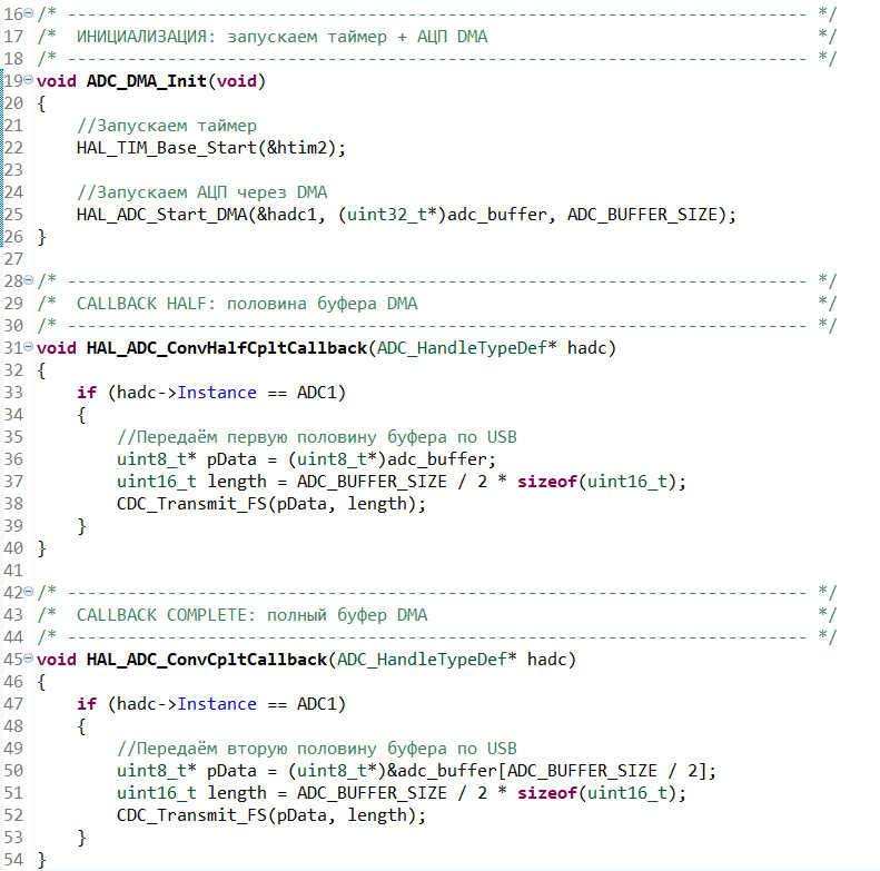 В функции void HAL_ADC_ConvCpltCallback(ADC_HandleTypeDef* hadc) мы по событию от DMA, что вторая половина буфера АЦП заполнена, передаем очередную порцию результата преобразования АЦП в USB.