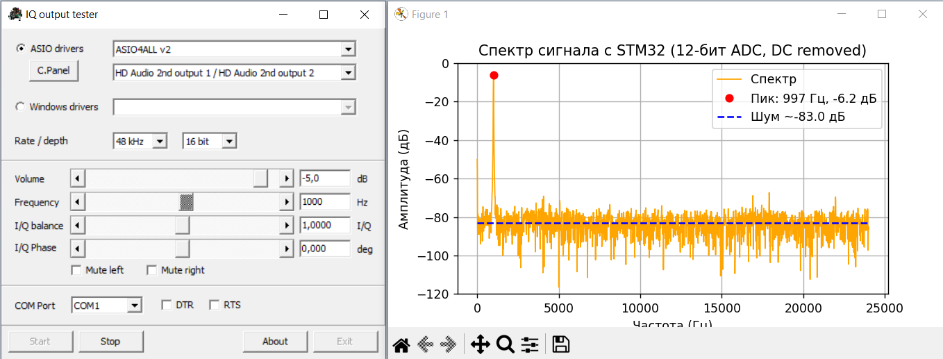 Цель подать сигнал на один из входов АЦП, и для его анализа использовать подключение по USB как VirtualComPort на ПК, а скриптом Python смотреть спектр оцифрованного сигнала и собирать WAV файл для анализа в программах, например как SpectraPLUS. Таким образом мы увидим именно то, что оцифровывает АЦП.