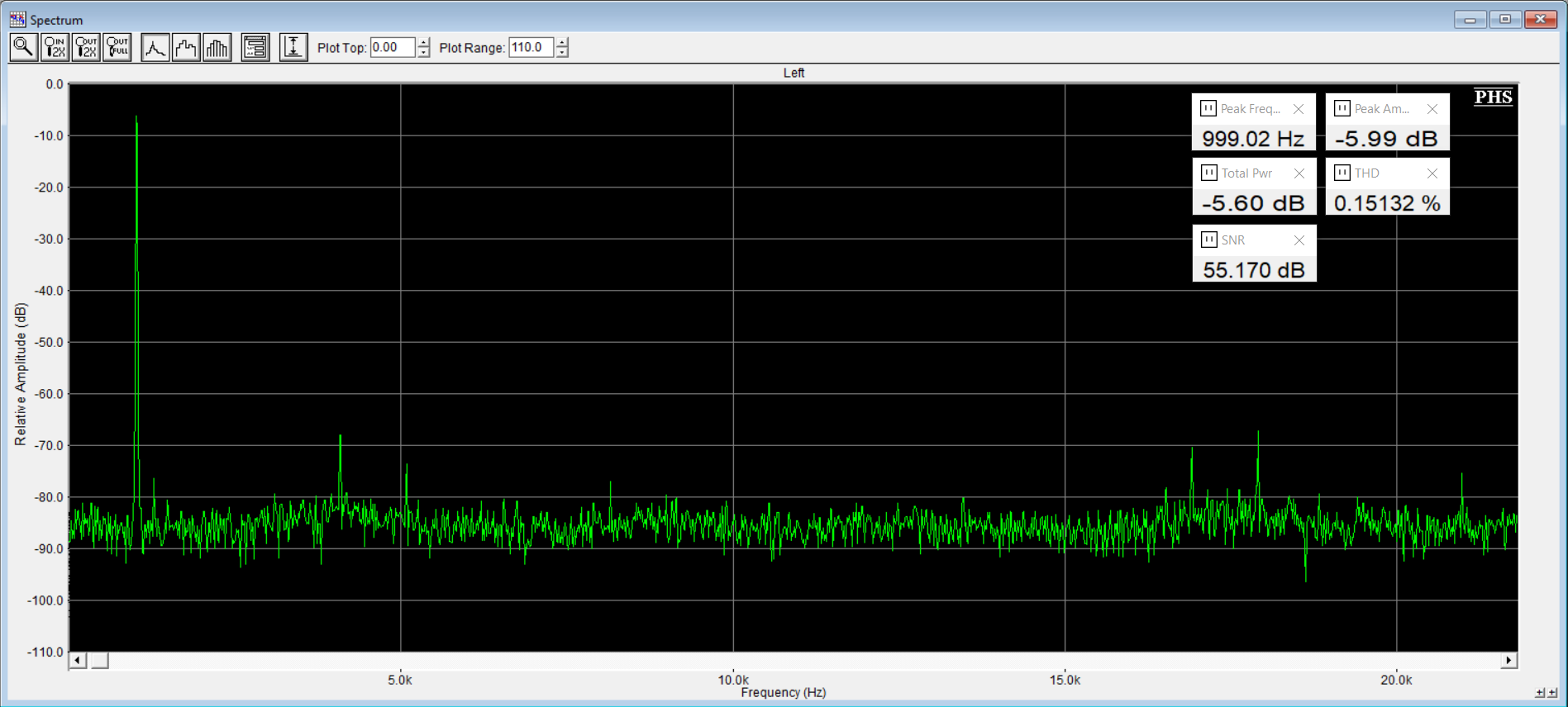 вот тут мы видим реальный шум ацп стмки, а пик в районе 4 кГц это скорее всего помеха по питанию от USB ноутбука. Далее через звуковую карту ноутбука я подаю на вход АЦП сигнал частотой 1 кГц и уровнем -0,5 дБ, смотрим