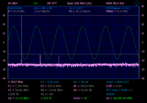 Из предыдущего эксперимента, знаем, что на выходе SBB2089Z у нас чистый сигнал уровнем ~30mW. Что бы получить чистый сигнал на выходе, надо поставить ФНЧ, если проверяем на частоте 28.45MHz, значит и ФНЧ нужен с частотой среза примерно 30MHz