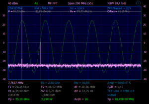 Наблюдаем чистый синус с уровнем ~1,3W. Поднимем напряжение питания до 20v, ток стока 250mA