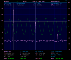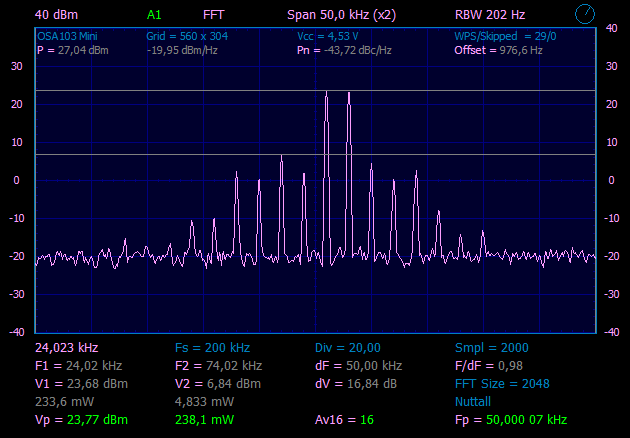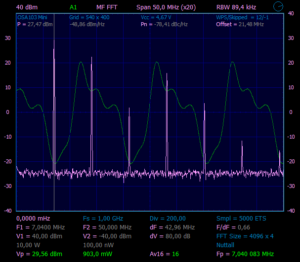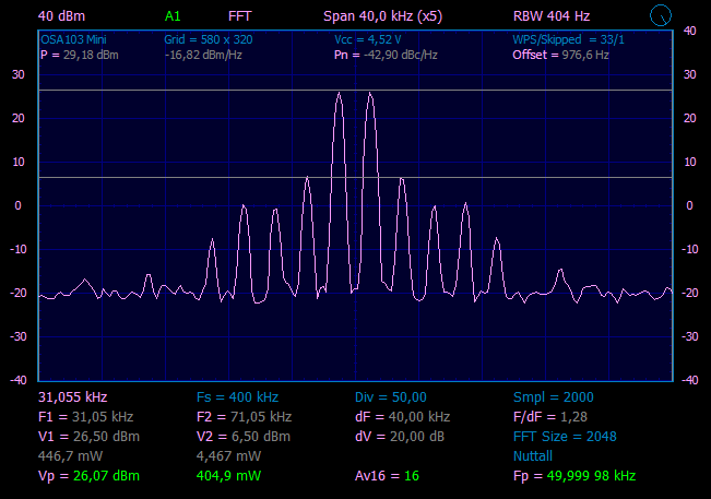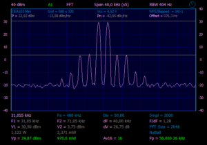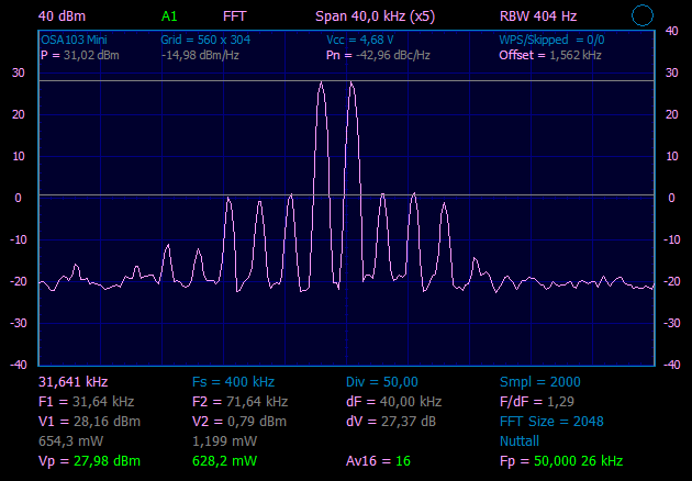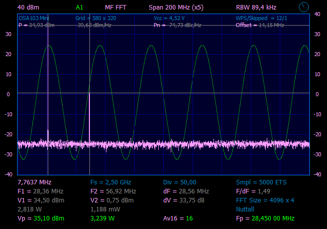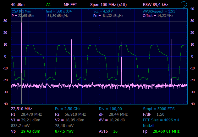 Из предыдущего эксперимента, знаем, что на выходе SBB2089Z у нас чистый сигнал уровнем ~30mW. Что бы получить чистый сигнал на выходе, надо поставить ФНЧ, если проверяем на частоте 28.45MHz, значит и ФНЧ нужен с частотой среза примерно 30MHz