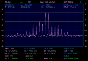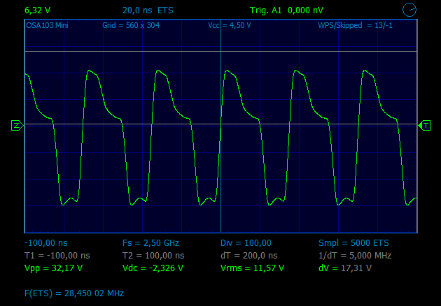 Наблюдаем чистый синус с уровнем ~1,3W. Поднимем напряжение питания до 20v, ток стока 250mA