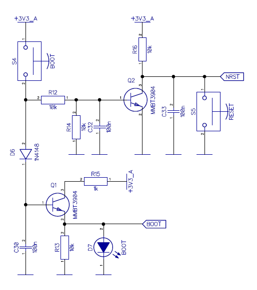 Я эту схему взял с китайской платки, только у меня транзисторов S8050 не оказалось поставил MMBT3904, работает она следующим образом, при замыкании кнопки BOOT транзистор Q2 открывается идет логический ноль сигнала NRST для перезагрузки стмки, так-же открывается транзистор Q1 и сигнал BOOT идет на стмку уровнем 1,8…1,9v, благодаря конденсатору C30 сигнал BOOT удерживается какое то время и стмка переходит в режим программирования USB DFU. А замечание следующее — на линии BOOT сигнал по даташиту на стмку должен быть равен или больше +2,4v. Согласен, замечание правильное, надо переделать будет. Реально у меня сигнал BOOT +1,95v стмка успешно переходит в режим программирования и в данном варианте схемы.