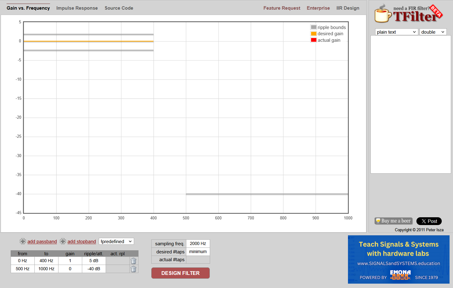 Вводим параметры интересующего нас фильтра, и кликаем по кнопке DESIGN FILTER