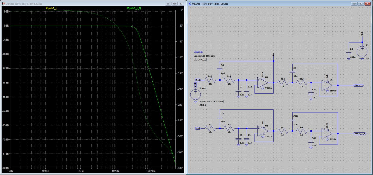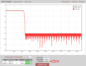 А что будет если уводить сигнал за границы панорамы больше чем +/-24 кГц? Тогда в нашей полосе мы увидим отголоски сигнала хоть и значительно меньшим уровнем! Но ведь у нас же перед АЦП стоит уже ФНЧ… Смотрим его расчетное АЧХ