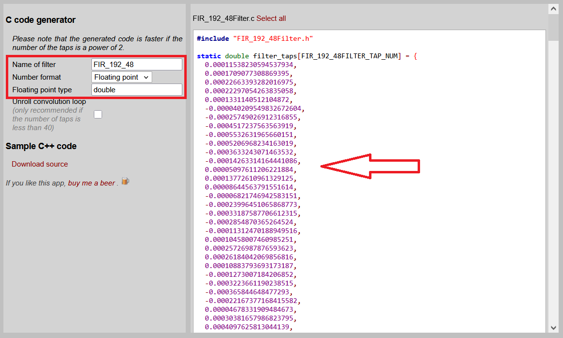 На вкладке Source Code можно скопировать коэффициенты фильтра