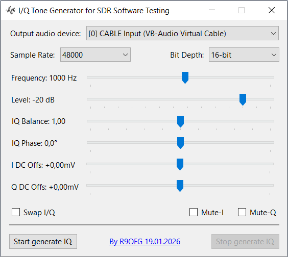 Для освоения ЦОС решил отрабатывать алгоритмы на ПК. Для этой цели понадобился аудио генератор IQ сигналов со следующими возможностями: