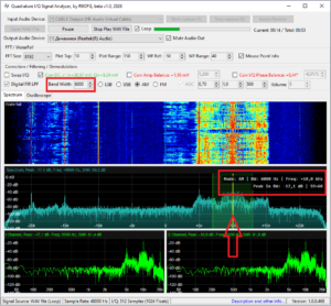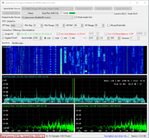 В правом верхнем углу окна комплексного спектра отображаются текущие параметры полосы пропускания, выбранный вид модуляции и якорная частота. Ниже отображаются пиковые значения сигнала в полосе пропускания в dB и по шкале S-metr.