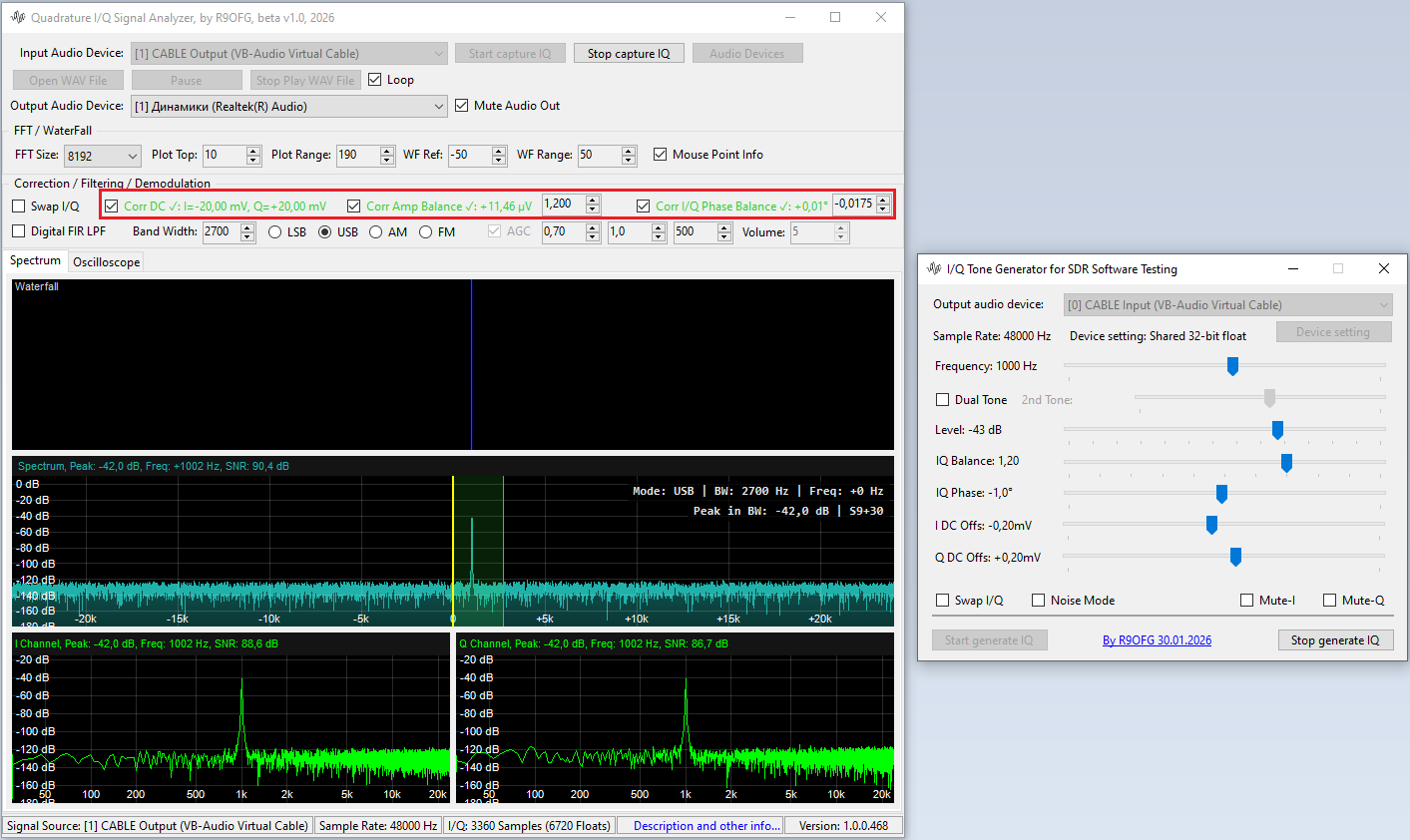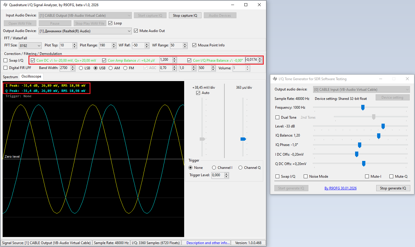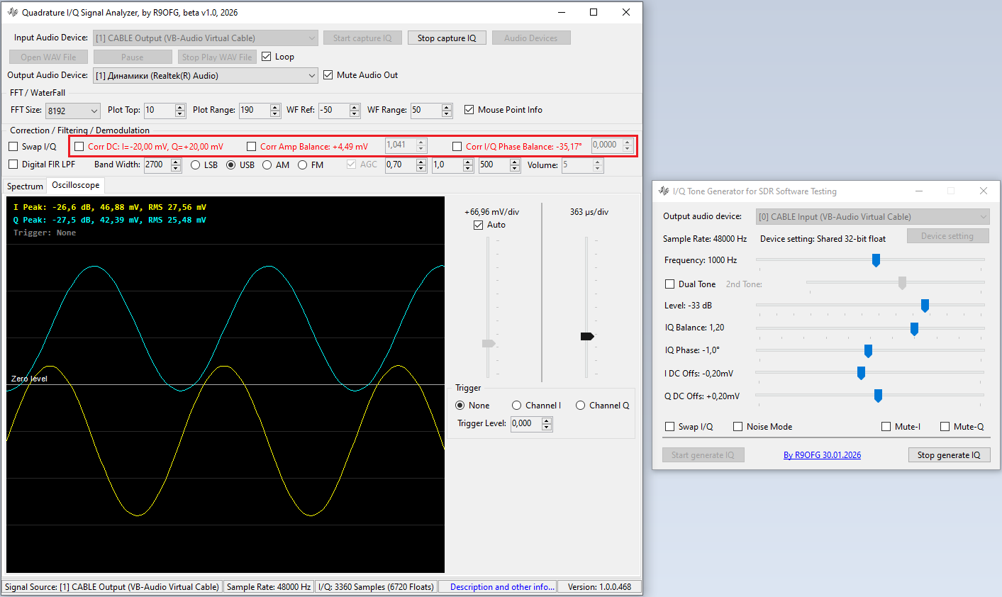 здесь все косяки сигналов наглядно видно, значения разбалансов видно в текстах чекбоксов включения коррекций для сигналов, на картинке выше выделены красным. Коррекция постоянной составляющей автоматическая, амплитудная и фазовая коррекции ручные, чтобы видеть значения примененных коэффициентов в настраиваемых соответствующих полях, применим коррекции для сигналов